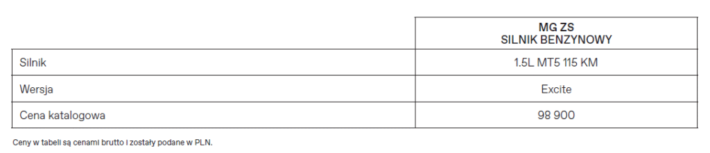 Wiążące ustalenie ceny, wyposażenia i specyfikacji pojazdu następuje w umowie jego sprzedaży zawieranej z dealerem marki MG, a określenie parametrów technicznych zawiera świadectwo homologacji typu pojazdu.